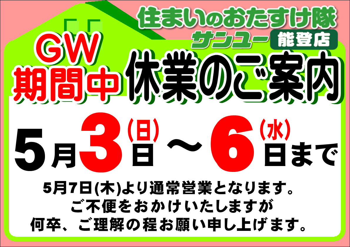 石川県能登町、珠洲市、町野町のリフォームのことなら!即日駆けつけ&工事保証の住まいのおたすけ隊サンユーへ